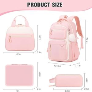 School Backpack for Girls, Bookpack with Bento Lunch Box, Insulated Bag & Utensils, 43oz Lunch Containers with 6 Compartment Schoolbag Set for Kids Elementary Middle Student (Pink)