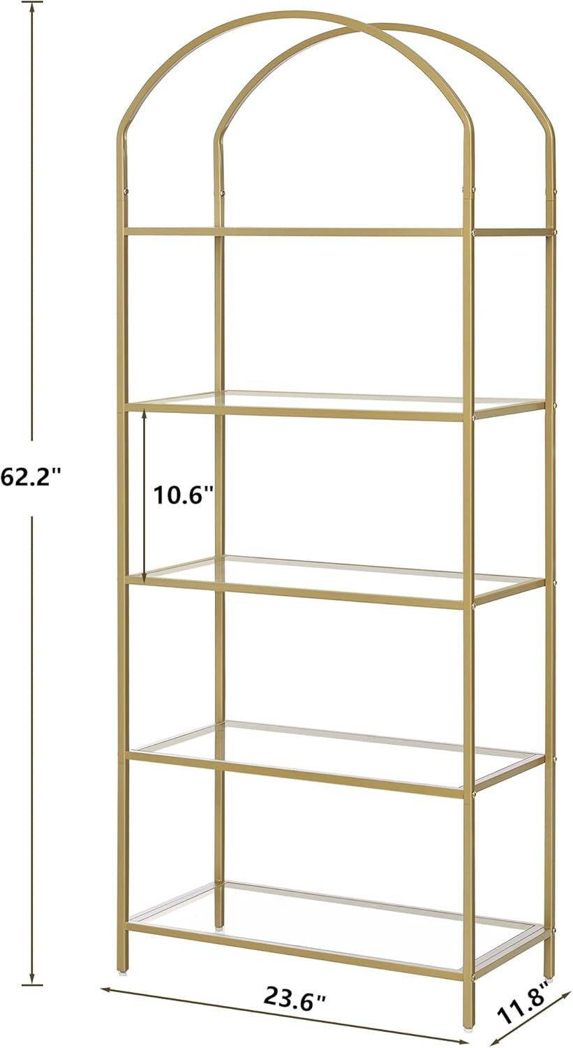 - Stylish and Functional: This 5-tier Steel Frame and glass Bookshelf with a gold finish is suitable for adding a touch of elegance to your home decor, while also providing ample storage and display space for your books, photos, plants, and other items.The arched design makes it a beautiful addition to any room