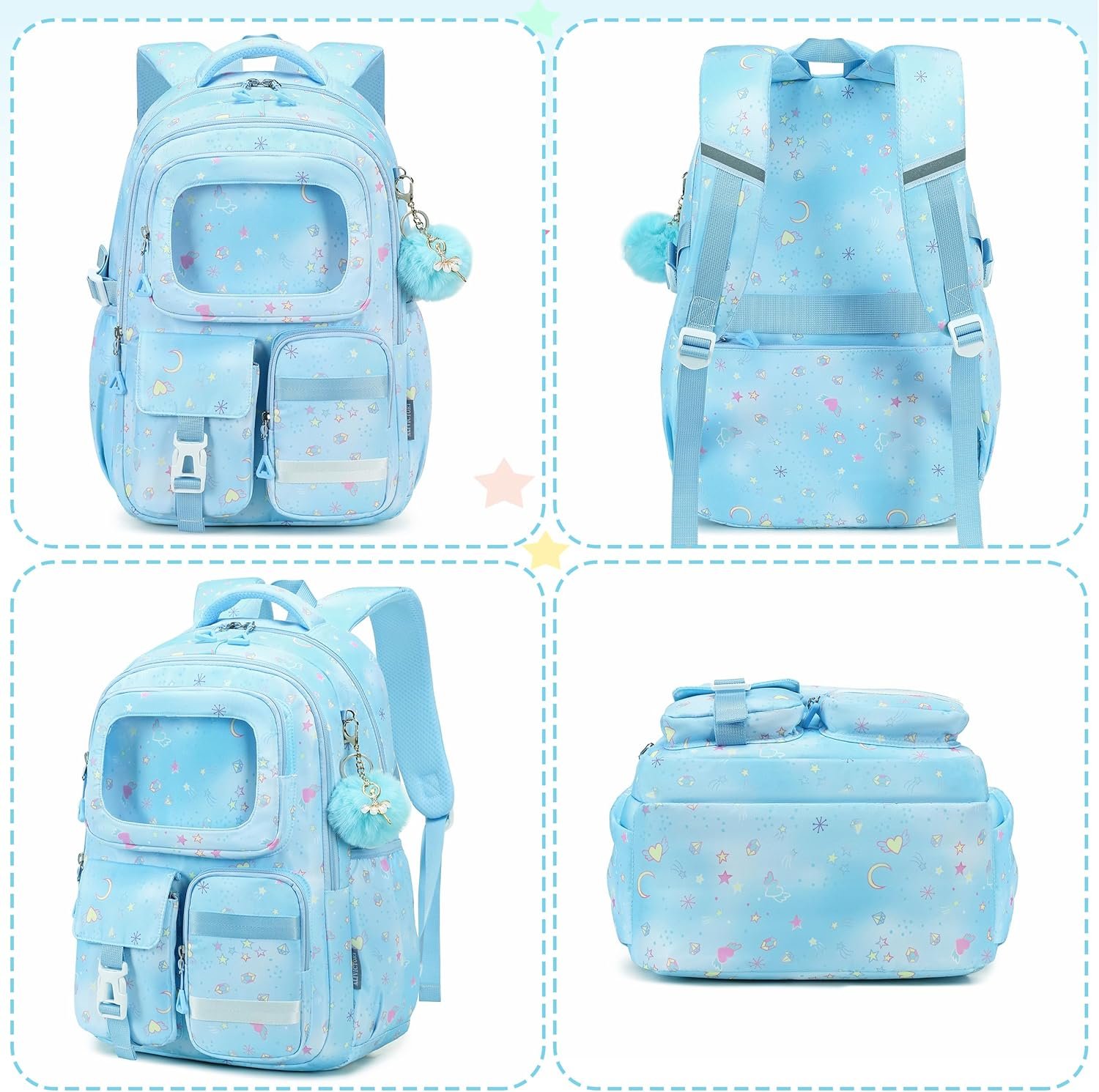 - School Backpack Set 3-in-1: Kid backpacks (16.3*11.6*5.5 Inch) with lunch bag (9.3*8.7*4.7 Inch) and pen bag (9.1*4.7 Inch).Weight: Total 1.45 lbs (3pcs); The children’s bookbags is lightweight and the size is perfect for girls or woman in school or daily life. Also,the kawaii backpacks present a fluffy ball key pendant ; It can be hang up on back pack or take down