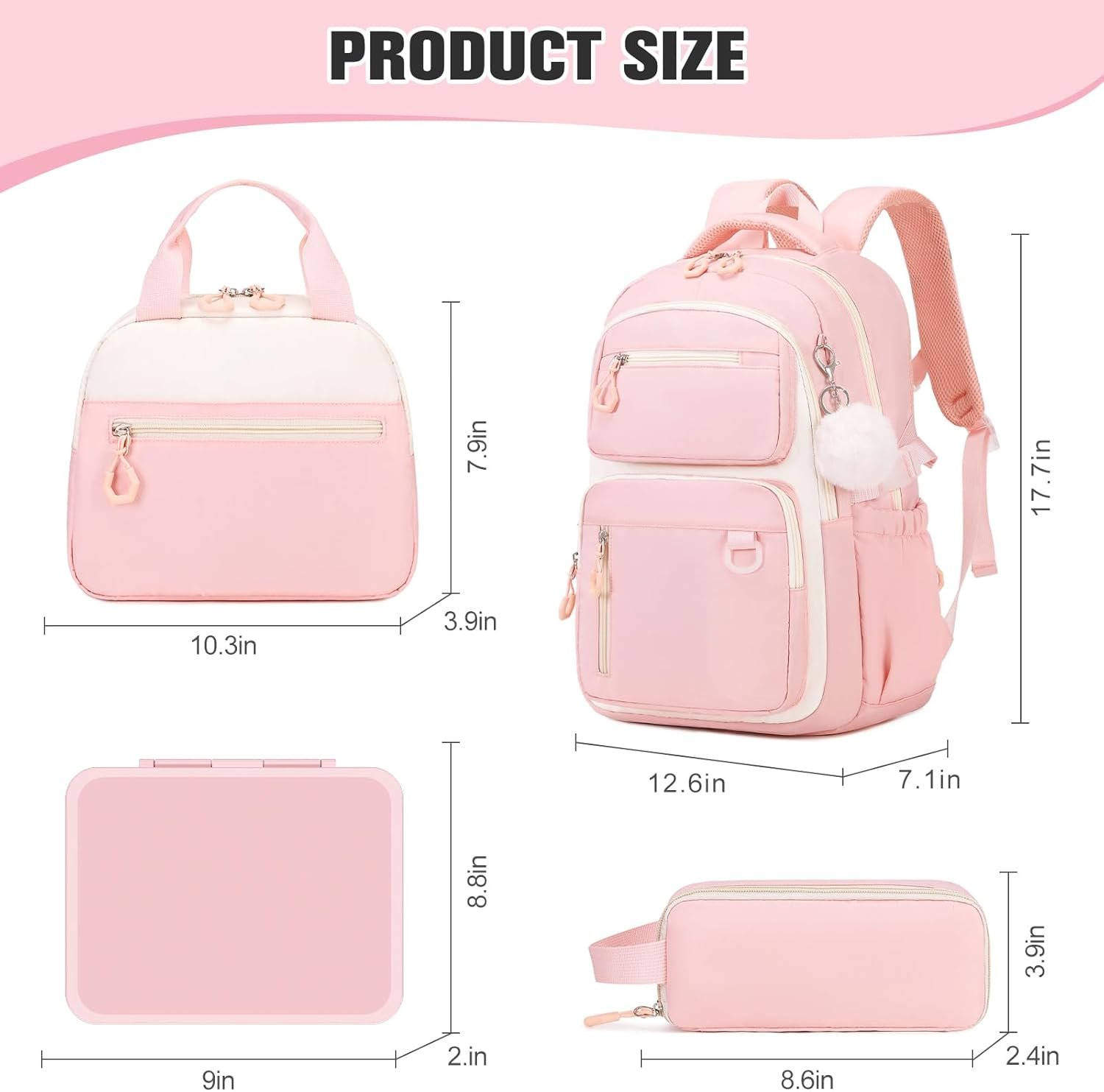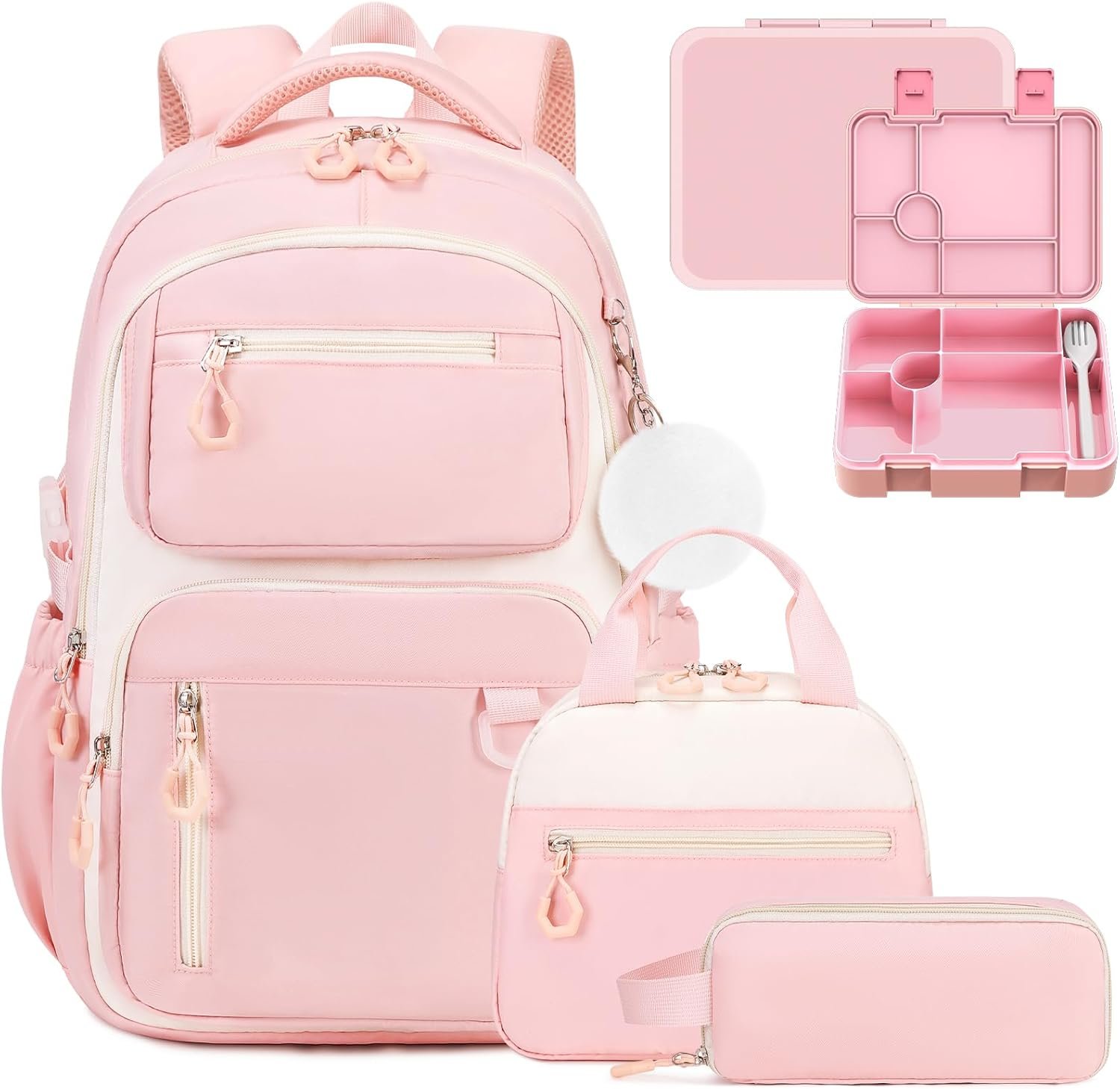 School Backpack for Girls, Bookpack with Bento Lunch Box, Insulated Bag & Utensils, 43oz Lunch Containers with 6 Compartment Schoolbag Set for Kids Elementary Middle Student (Pink)